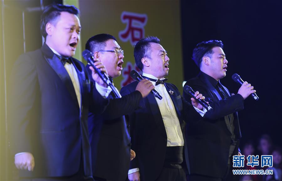 1月14日,中央歌剧院的歌唱家们在慰问演出上表演男声四重唱。 当日,“我们的中国梦”——文化进万家中央歌剧院文艺小分队来到重庆市石柱土家族自治县进行慰问演出,歌唱家们为现场观众演唱了《我爱你中国》《红旗飘飘》《我和我的祖国》《共筑中国梦》《达坂城的姑娘》等众多经典歌曲。 新华社记者 王全超 摄