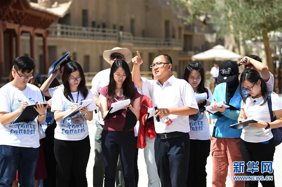 敦煌研究院讲解员边磊(前)为香港大学生讲解莫高窟历史(2018年7月12日摄)。 新华社记者 陈斌 摄