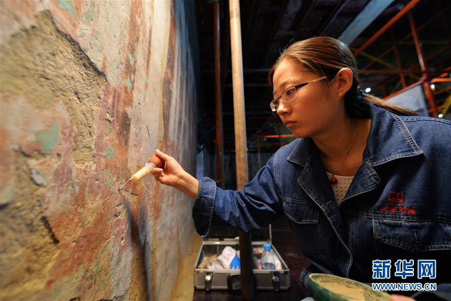 敦煌研究院技术人员在莫高窟98窟内对病害壁画进行修复(2014年9月3日摄)。 新华社记者 陈斌 摄