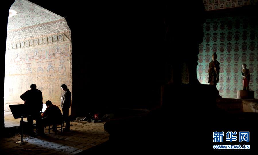 三名敦煌研究院数字中心工作人员在洞窟内进行数字采集工作(2014年9月1日摄)。 新华社记者 陈斌 摄