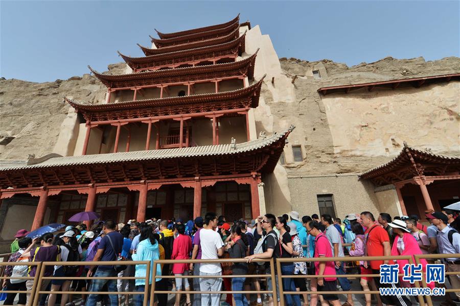 游客排队等待进入莫高窟“九层楼”参观(2016年8月4日摄)。 新华社记者 陈斌 摄