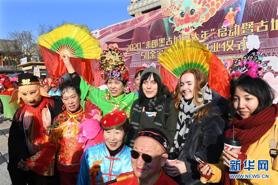 1月17日,青岛大学的外国留学生在启动仪式上和演员合影。 当日,山东省青岛市“2020来即墨古城过大年”活动启动,古城年货大集、各地特色小吃、非遗工艺品展示、民俗文化展演等持续上演,拉开迎春庆祝活动的序幕。 新华社记者 李紫恒 摄