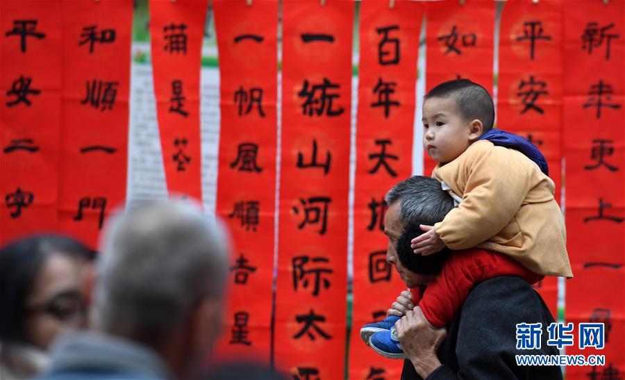 1月18日,人们在南宁市少年儿童图书馆观看刚刚写好的春联。
