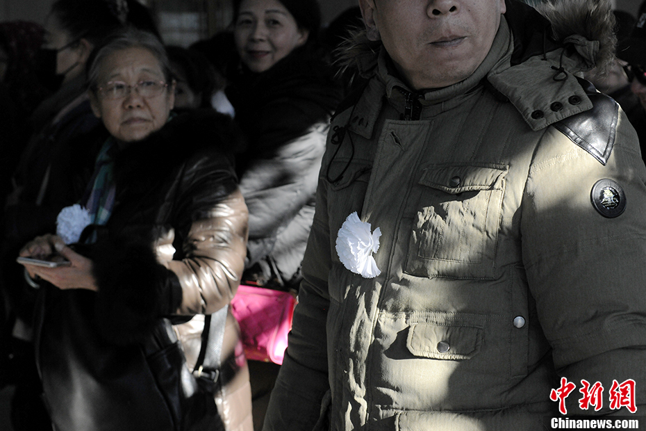 1月20日,著名主持人赵忠祥遗体告别仪式在北京八宝山举行,现场民众自发排起长队在礼堂外等候悼念。图为民众排队等候进入礼堂悼念。中新网记者 李骏 摄