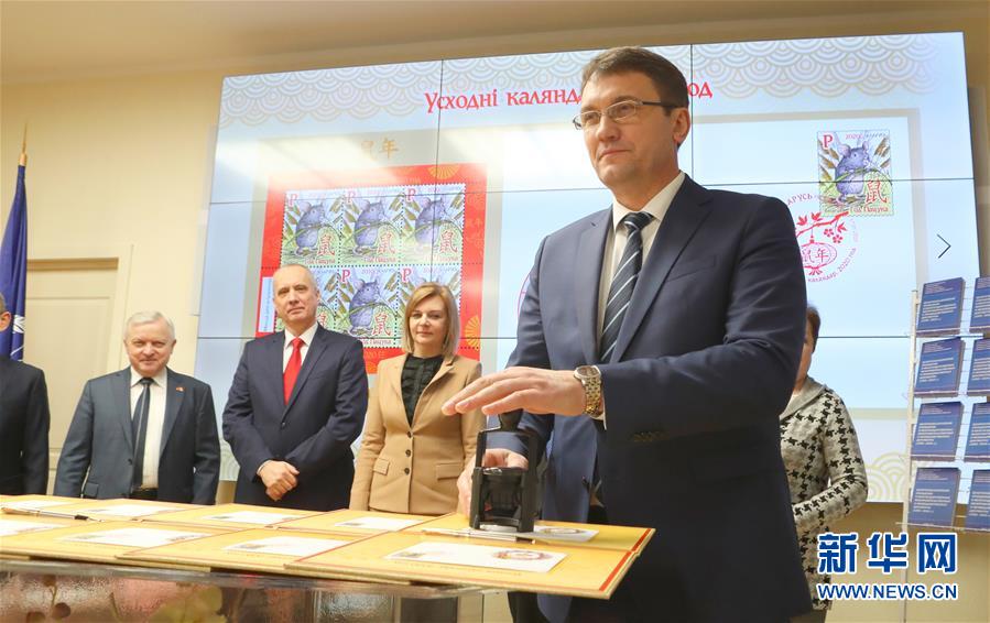 1月20日,在白俄罗斯首都明斯克,白通信与信息化部部长舒利甘在鼠年生肖邮品上盖戳。20日是中白两国建交28周年纪念日。为此,白俄罗斯当天发行中国农历鼠年生肖邮票并举行首日封发行仪式。 新华社发(任科夫摄)
