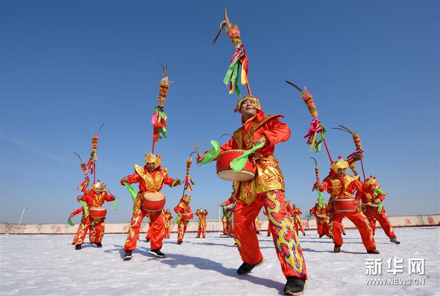 1月20日,招子鼓队员在河北省隆尧县千户营乡千户营村文化广场上表演。 新华社记者 牟宇 摄
