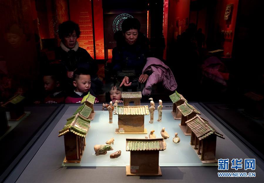 参观者在观看唐代三彩院落建筑模型(1月20日摄)。 新华社记者 刘潇 摄