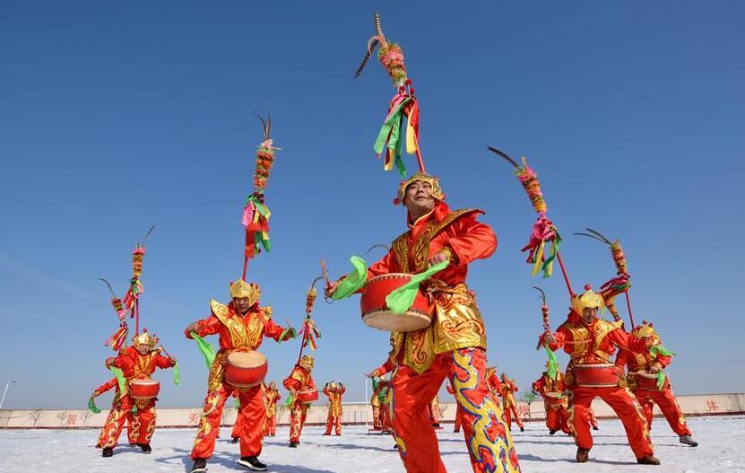 1月22日,在T302次列车上,中国铁路沈阳局集团有限公司长春客运段工作人员为旅客表演节目。