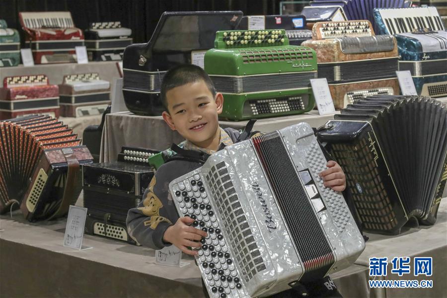 在塔城市手风琴博物馆,当地一名小朋友为游客演奏手风琴(1月21日摄)。新华社记者 赵戈 摄