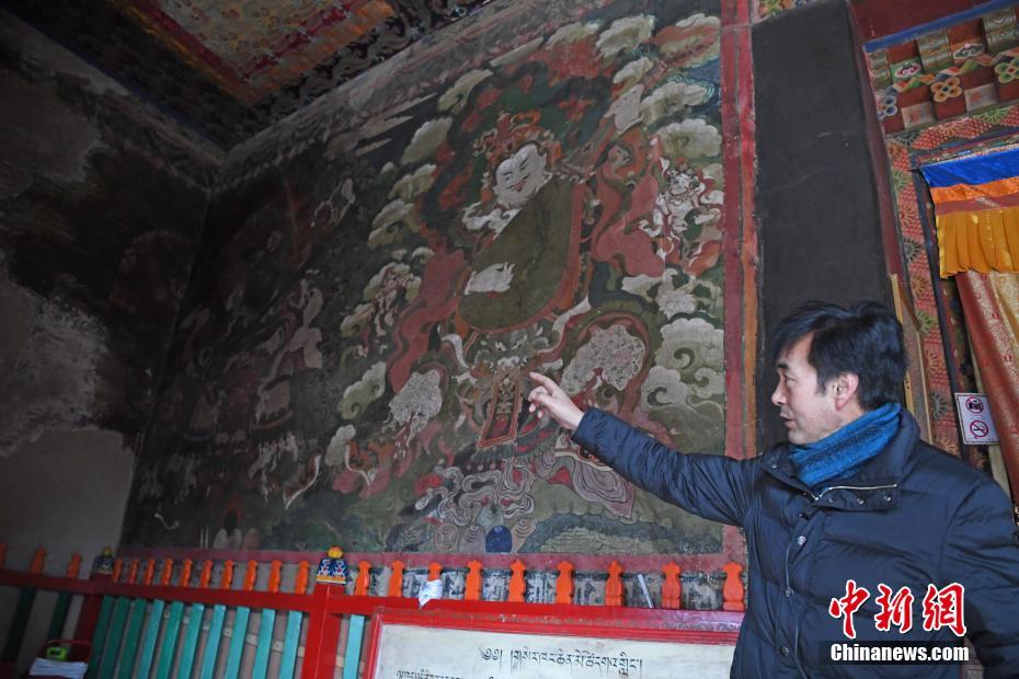 1月22日,甘肃省甘南藏族自治州夏河县文体广电和旅游局副局长索南嘉接受中新社记者专访时介绍,截至目前,“世界藏学府”拉卜楞寺文物保护工程已经完成了原计划项目的90%,其中14个佛殿已完成文物本体修缮,7个佛殿完成壁画修复,修复面积达6000多平方米。图为索南嘉介绍拉卜楞寺佛殿壁画修复情况。中新社记者 杨艳敏 摄