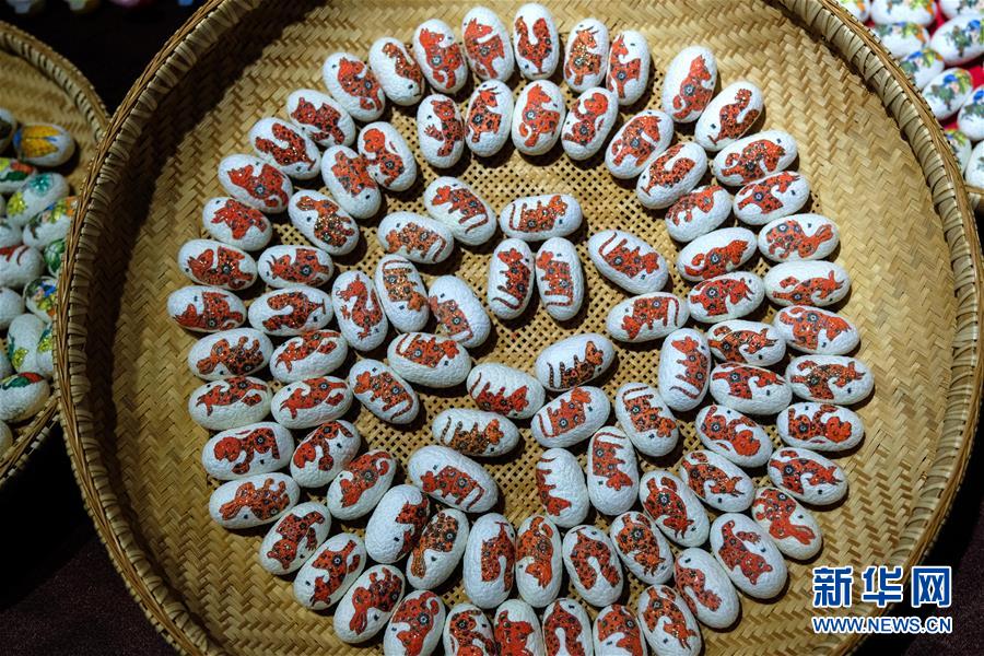1月24日拍摄的生肖特色茧画。 农历鼠年将至,浙江省桐乡市“江南茧画”工艺创始人陈建清与同事们创作了一批鼠年特色茧画,迎接新春佳节的到来。“江南茧画”运用天然蚕茧作原料,用烘、染、固化、绘、艺术组合等处理,创作出极具水乡特色的蚕茧画作品。 新华社记者 徐昱 摄