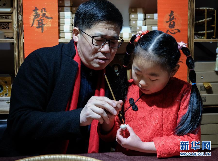 1月24日,陈建清(左)在指导一名学生创作鼠年特色茧画。 农历鼠年将至,浙江省桐乡市“江南茧画”工艺创始人陈建清与同事们创作了一批鼠年特色茧画,迎接新春佳节的到来。“江南茧画”运用天然蚕茧作原料,用烘、染、固化、绘、艺术组合等处理,创作出极具水乡特色的蚕茧画作品。 新华社记者 徐昱 摄