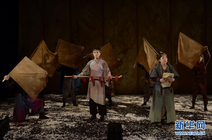 2月2日,在法国巴黎,中国国家话剧院演员表演《行者无疆》。 中国国家话剧院话剧《行者无疆》于1月28日至2月2日在巴黎与法国观众见面。作品以张骞出使西域的故事为灵感,由中法艺术家联合打造。该剧于2018年在中国国家话剧院首演。 新华社发(塞利亚·迪蒙·马莱摄)