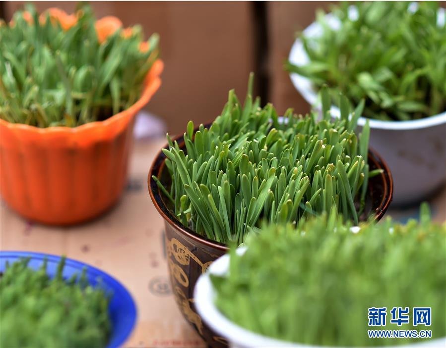 2月19日拍摄的拉萨街头出售的新年饰品——青稞苗。 藏历新年即将到来,拉萨市民忙着购买年货、布置新年房屋等。 新华社记者 觉果 摄