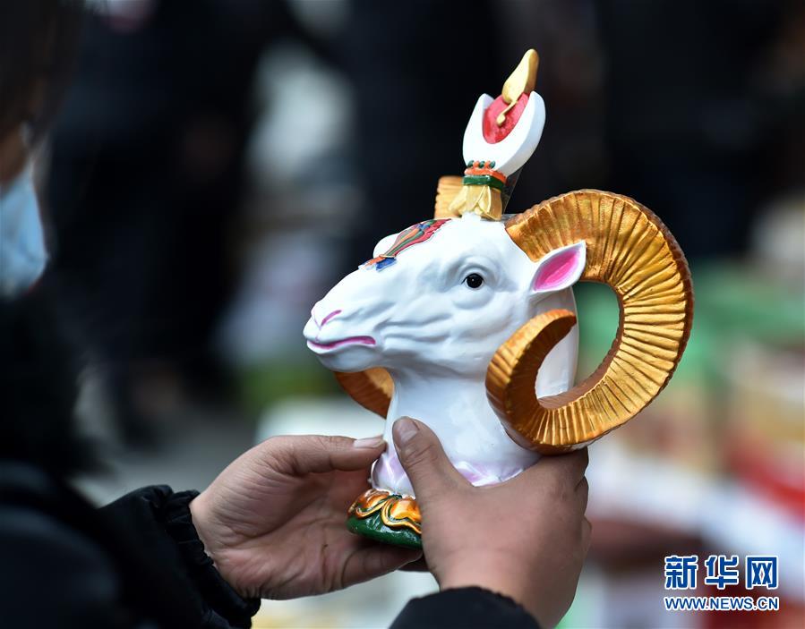 2月19日,一名拉萨市民在街头选购新年饰品吉祥“羊头”,祈愿新年好兆头。 藏历新年即将到来,拉萨市民忙着购买年货、布置新年房屋等。 新华社记者 觉果 摄