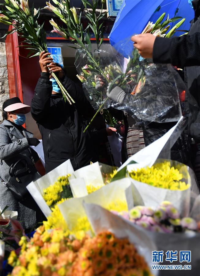 2月22日,拉萨市民在购买鲜花。 藏历新年即将到来,拉萨市民忙着购买年货、布置新年房屋等。 新华社记者 觉果 摄