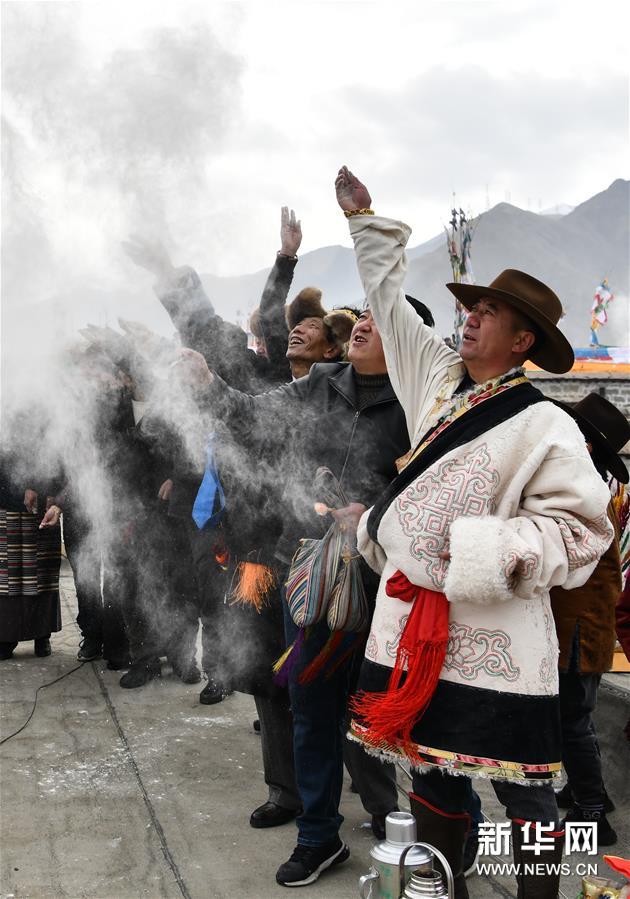 2月26日,身着盛装的拉萨藏族群众在屋顶上举行换经幡的传统仪式。新华社记者 晋美多吉 摄