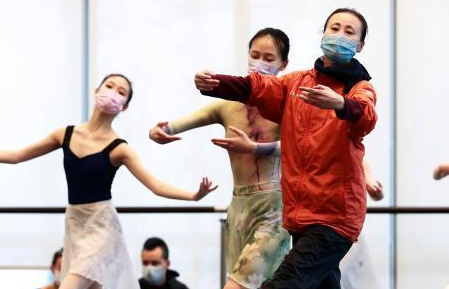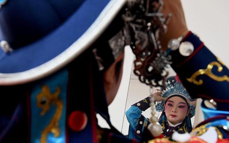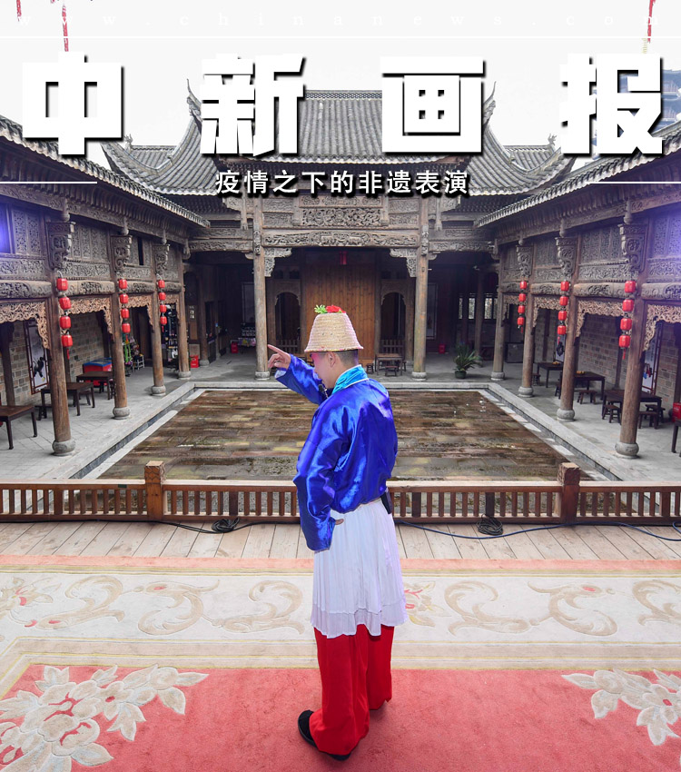 3月12日, 在长沙铜官窑古镇内,湖南花鼓戏、口技、长沙皮影戏等非物质文化遗产项目轮番登场。为了不影响唱腔等演出效果,正式演出表演者需摘下口罩表演,排练时再戴上防止传染。图为表演者在舞台中央进行了一场没有观众的花鼓戏表演。中新社记者 杨华峰 摄