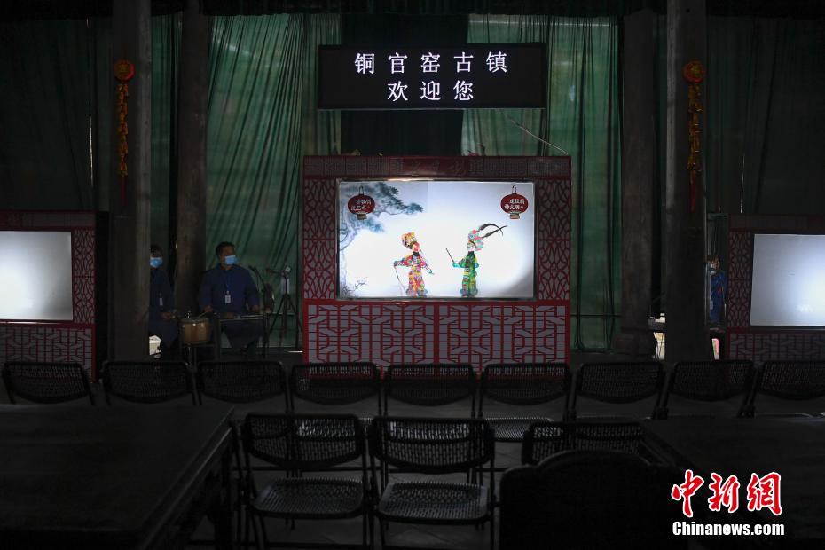 表演者们正在表演长沙皮影戏《龙虎斗》。受疫情影响,虽台下很少能看见观众,但他们依旧用最饱满的热情演出。中新社记者 杨华峰 摄