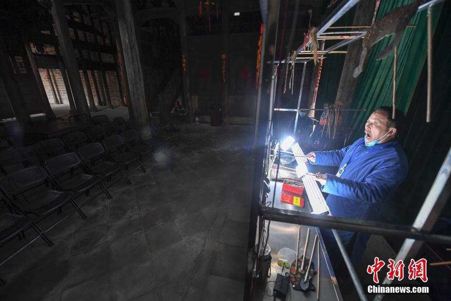 在没有观众的剧场内,表演者王碧元舞动着皮影卖力献唱。中新社记者 杨华峰 摄