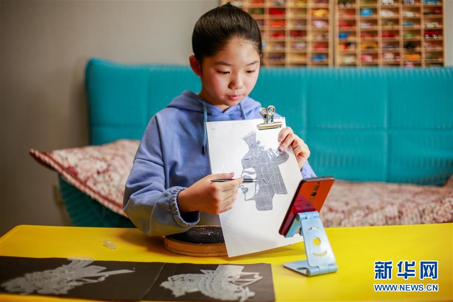 3月15日,河北省滦州市中山实验学校五年级学生高函瑀通过网络在老师的指导下学习雕刻滦州皮影。新华社记者 牟宇 摄
