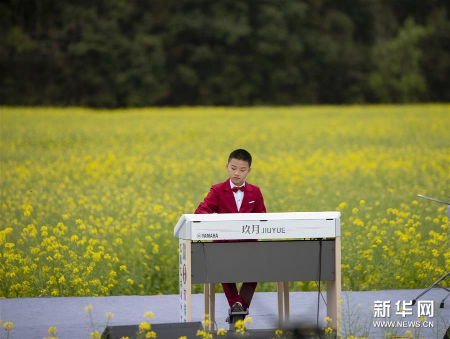 3月16日,一名小演员在李坑村的“花田音乐会”上演奏。当日,一场别开生面的“花田音乐会”在江西省婺源县秋口镇李坑村的油菜花海中举行,带给游人新鲜的视听感受。新华社记者 张浩波 摄