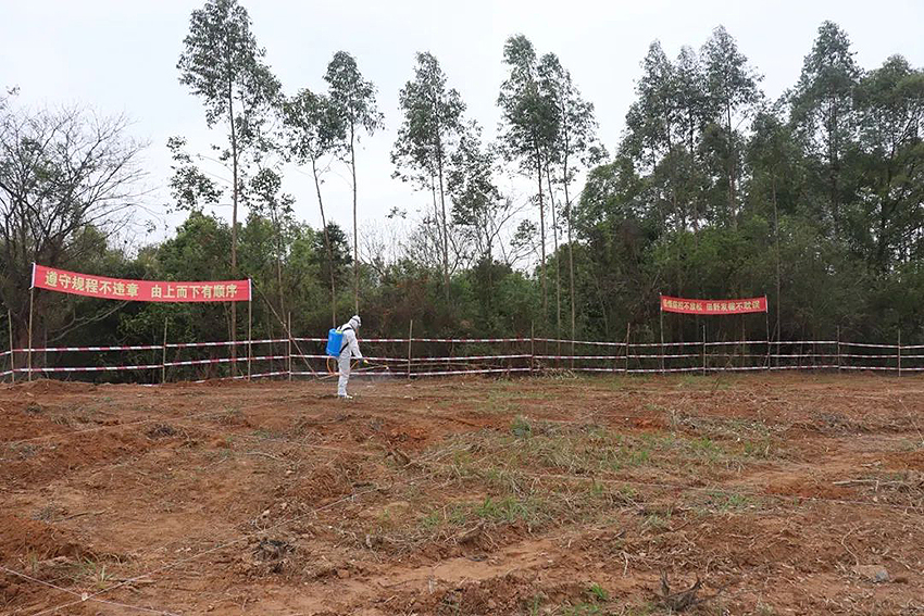 工作人员对新建广州(新塘)至汕尾铁路建设用地考古发掘现场进行全面消毒。