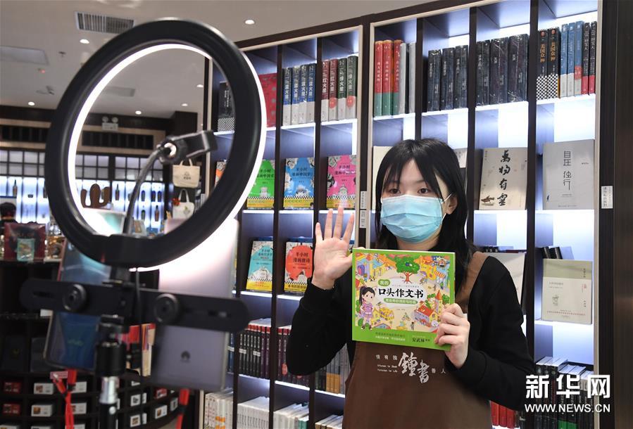 3月18日,书店工作人员用手机直播推荐书籍。新华社记者 任超 摄