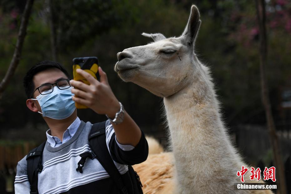 3月21日,游客与一只叫“白雪”的羊驼合影。当日,云南野生动物园正式恢复开放。该景区在疫情防控期间将每日核定客流量下调至景区承载量的50%,并暂缓开放部分游乐设施和室内场景,对园区定时定点消毒、对动物定期进行检查,保证动物们身体健康。中新社记者 康平 摄