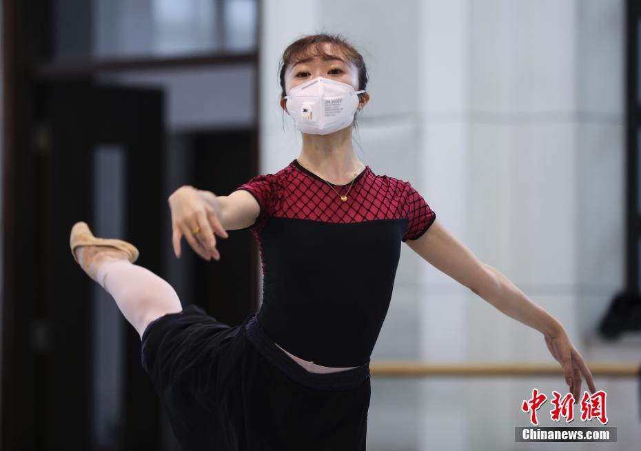 3月24日,中央芭蕾舞团的女演员在排练厅戴着口罩起舞。日前,留守北京的部分中芭演员分批分时段回归排练教室,戴着口罩练功。中新社记者 赵隽 摄