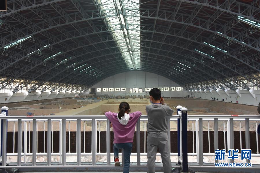 3月25日,游客在参观秦始皇帝陵博物院兵马俑一号坑展厅。 当日,秦始皇帝陵博物院恢复开放。根据疫情防控需要,博物院目前设置的单日最大观众接待量为8000人次,同时为保证游客安全、有序参观,博物院实行个人实名线上预约购票参观制,暂停团队接待,取消现场售票,观众须全程佩戴口罩参观。 新华社记者 杨一苗 摄