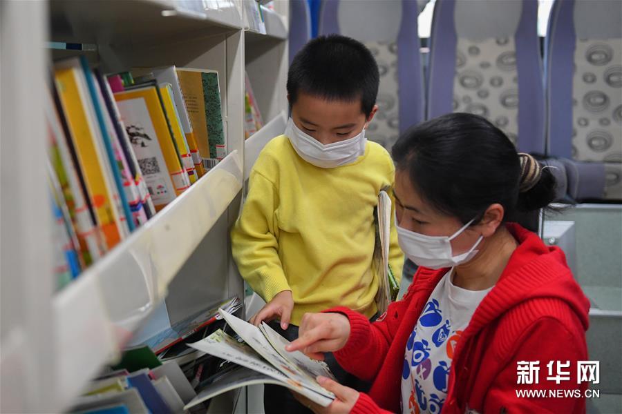 3月26日,在长沙岳麓区石岭塘社区,家长和小朋友在流动图书馆里挑选书籍。新华社记者 陈泽国 摄