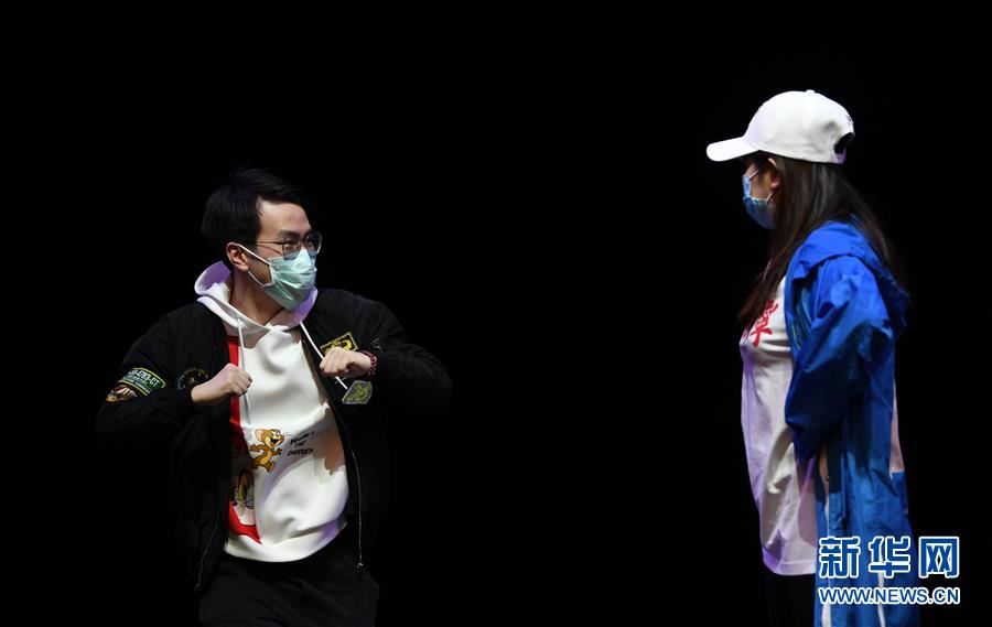 3月26日,在陕西人民艺术剧院,互联网青年话剧团演员苗盼羽(左)和张力子在做表演练习。 近日,随着疫情防控形势好转,在陕西省西安市,陕西演艺集团部分文艺院团根据自身情况恢复了练功、排练、线上表演等工作,同时开展丰富的战“疫”主题创作。 新华社记者 李一博 摄