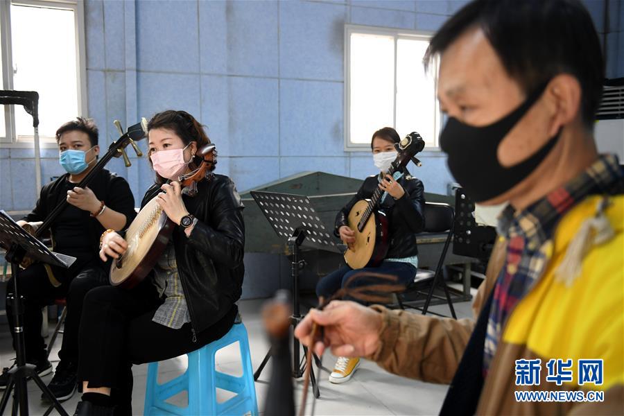 3月26日,在陕西省京剧院,乐队在琴房练习。 近日,随着疫情防控形势好转,在陕西省西安市,陕西演艺集团部分文艺院团根据自身情况恢复了练功、排练、线上表演等工作,同时开展丰富的战“疫”主题创作。 新华社记者 李一博 摄