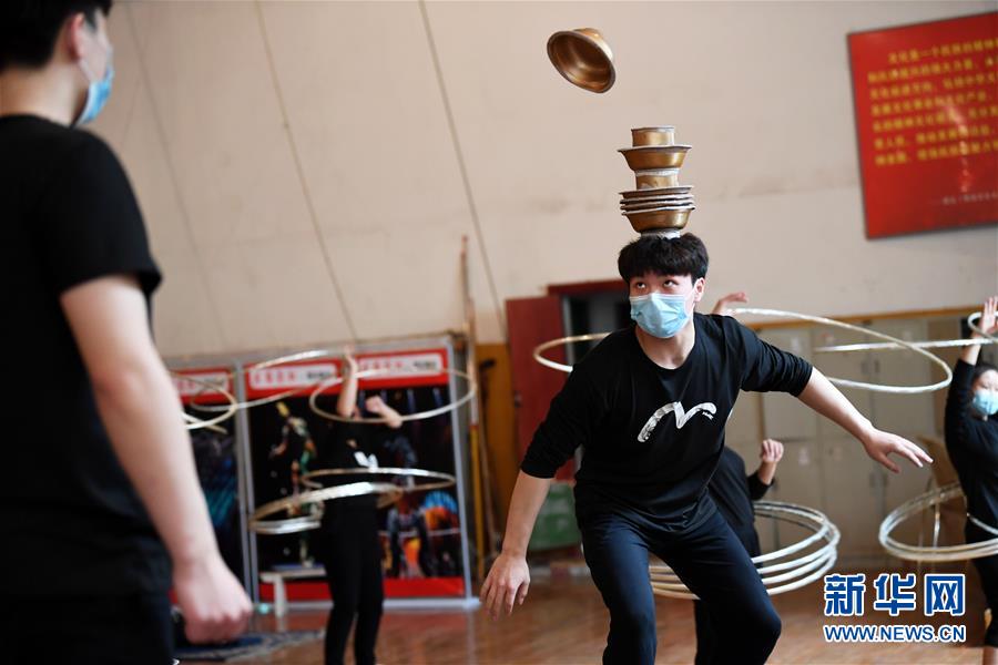 3月26日,在陕西省杂技艺术团,杂技演员在练功。 近日,随着疫情防控形势好转,在陕西省西安市,陕西演艺集团部分文艺院团根据自身情况恢复了练功、排练、线上表演等工作,同时开展丰富的战“疫”主题创作。 新华社记者 李一博 摄