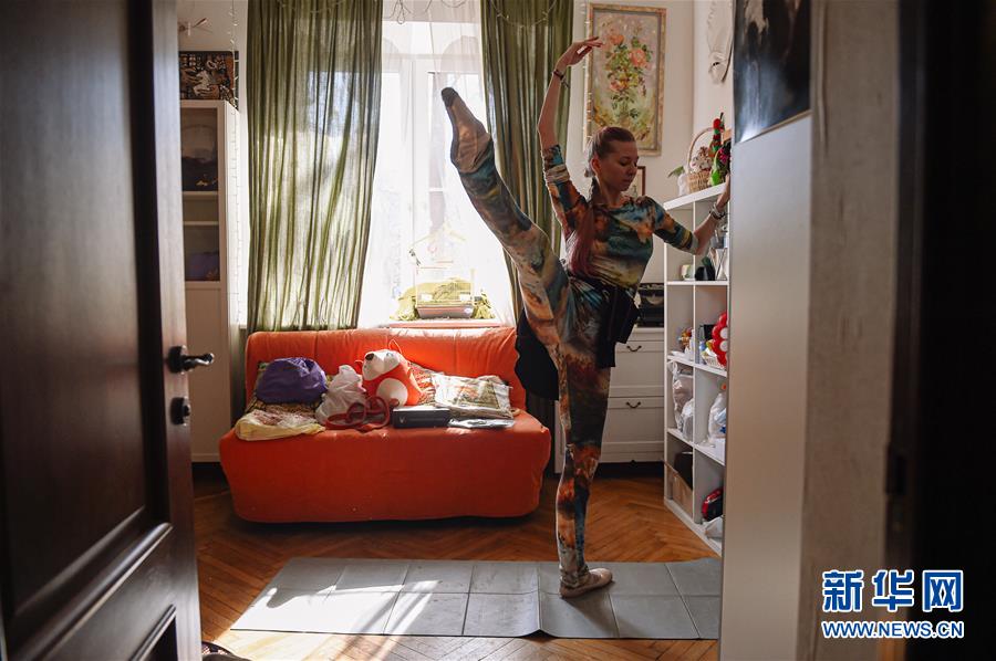 3月28日,在俄罗斯首都莫斯科,瓦列里娅在家中训练。 当日,莫斯科进入疫情防控假期第一天。由于所在的剧院因疫情关闭,31岁的芭蕾舞演员瓦列里娅·波别金斯卡娅不得不居家训练。俄总统普京25日发表电视讲话,宣布3月28日至4月5日全国放假,以防止新冠病毒在俄境内大规模传播。 新华社发(叶甫盖尼·西尼岑摄)