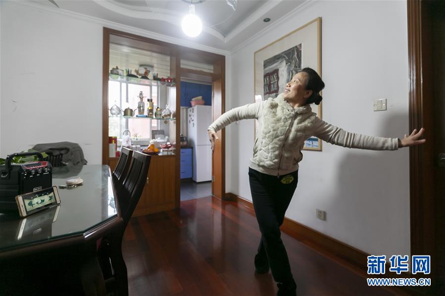 舞蹈队成员董仙玲在家中练舞(3月29日摄)。 “鸿雁舞蹈队”是上海市闵行区古美街道的一个市民舞蹈团。受新冠肺炎疫情影响,舞蹈队成员们无法参与舞蹈集中排练,只能“宅”在家中练习舞蹈。日前,队员们正在家中加紧练习网上新学的舞蹈。 新华社发(王翔 摄)