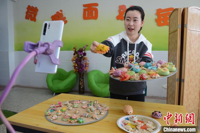 4月3日,老师通过手机录制视频,向小学生们展示面塑。 刘文华 摄
