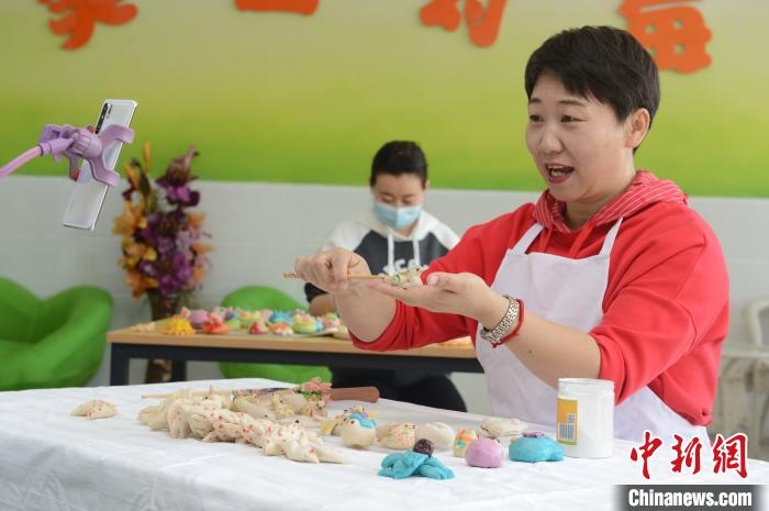 4月3日,老师通过手机录制视频,向小学生们展示面塑寒燕的制作过程。 刘文华 摄