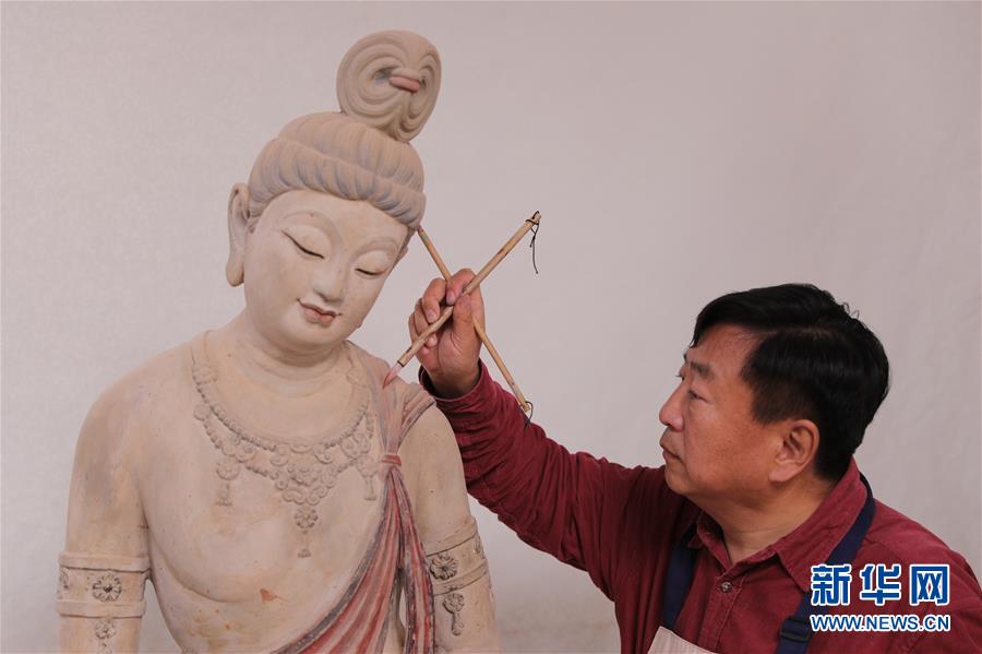 4月5日,杜永卫在工作室给泥塑上色。新华社发(杜哲宇 摄)