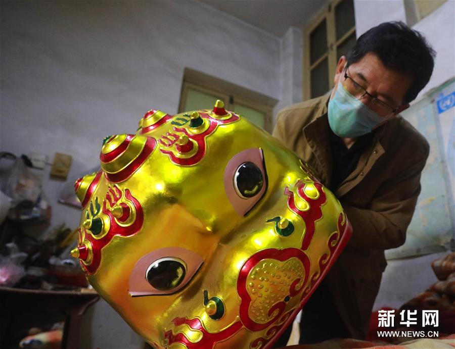 4月2日,在河北省石家庄市正定县,河北省级非遗龙狮道具制作传承人马小增在安装龙狮的眼睛。 新华社发(刘沛然 摄)