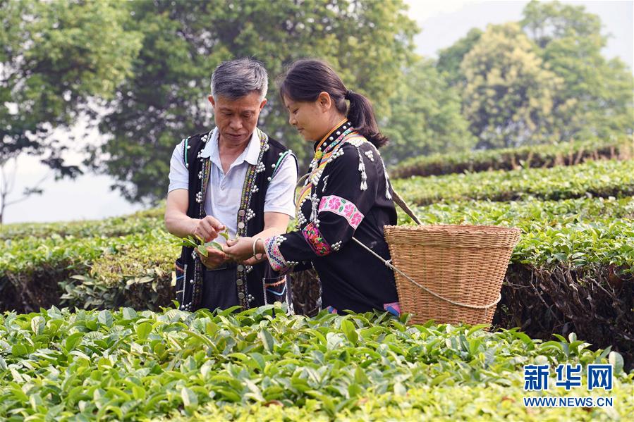 4月10日,李兴昌(左)在宁洱哈尼族彝族自治县普洱山生态茶园向学员介绍茶叶采摘方法。新华社记者 杨宗友 摄