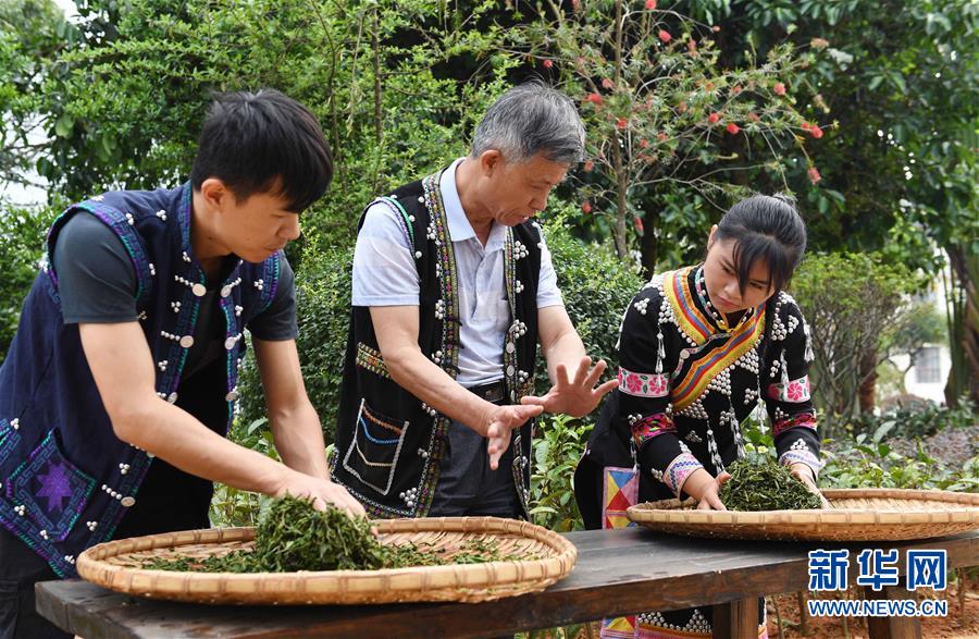 4月10日,李兴昌(中)在宁洱哈尼族彝族自治县普洱茶制作技艺传习基地指导学员对茶叶揉捻。新华社记者 杨宗友 摄