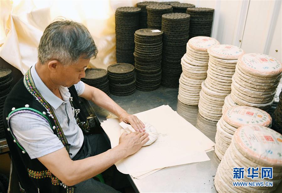 4月10日,李兴昌在宁洱哈尼族彝族自治县普洱茶制作技艺传习基地包装茶饼。新华社记者 杨宗友 摄
