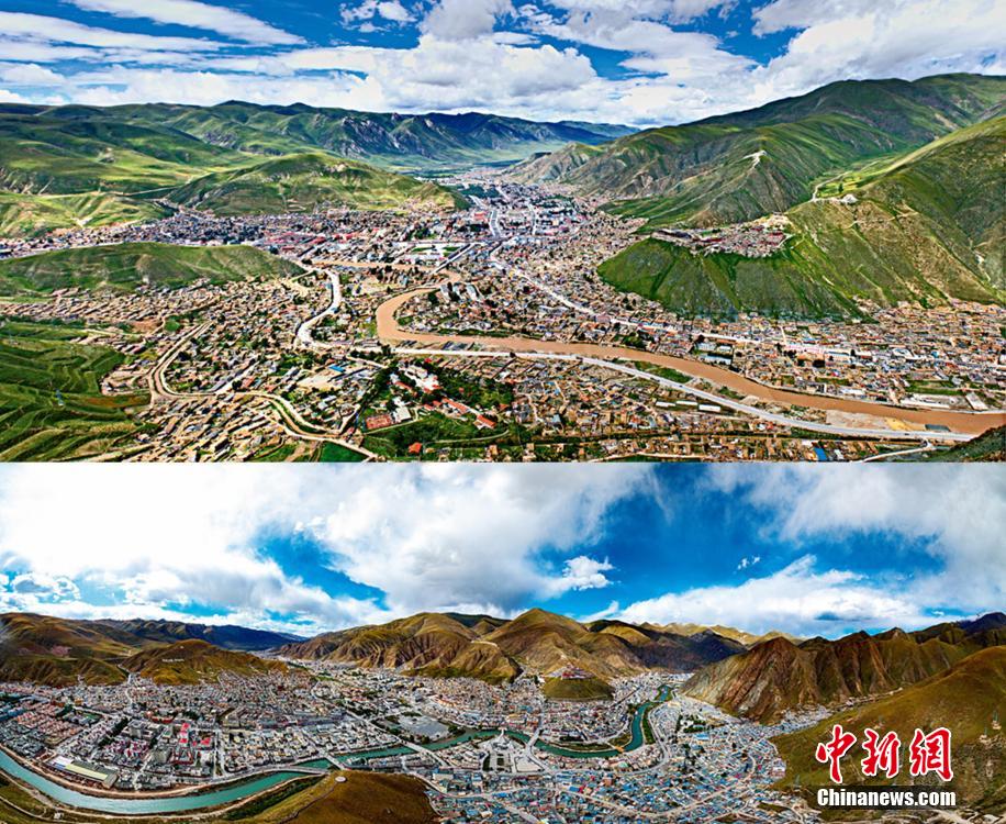 4月14日,在青海玉树“4·14”抗震救灾十周年之际,由玉树州委州政府组织,玉树州住房和城乡建设局协同青海地理信息产业发展有限公司、青海省地理空间和自然资源大数据中心、青海省自然资源遥感中心共同编著的《感恩祖国----玉树地震十周年纪念地图集》出版发行。该《图集》由序章、大地之殇、天降大爱、涅槃重生、展翅高飞、历史铭记六个篇章组成,包括79幅专题地图、60余幅统计图表、300余张照片以及相关文字说明。2010年4月14日,青海省玉树地区发生7.1级强烈地震,造成了巨大人员伤亡和财产损失。图为震前(上)与震后(下)的玉树州结古镇对比图。青海省自然资源厅 供图