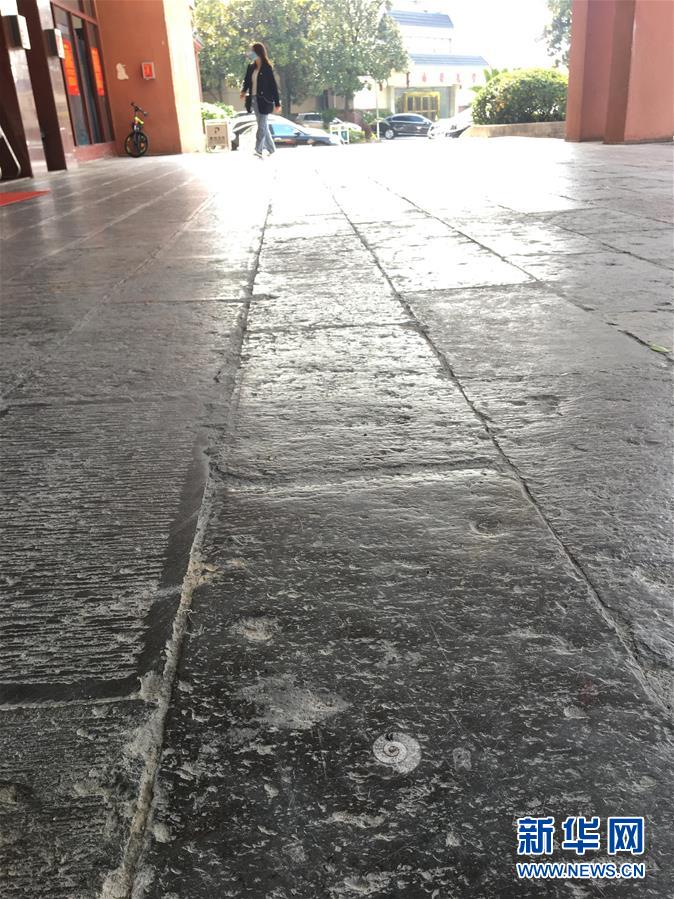 这是4月9日在张家界市区一路面拍摄的远古海洋生物化石地板。新华社记者 苏晓洲 摄