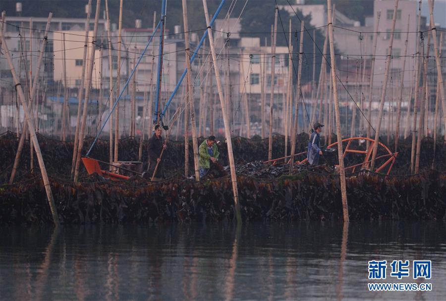 4月16日,在福建省霞浦县长春镇,当地渔民在收海带。