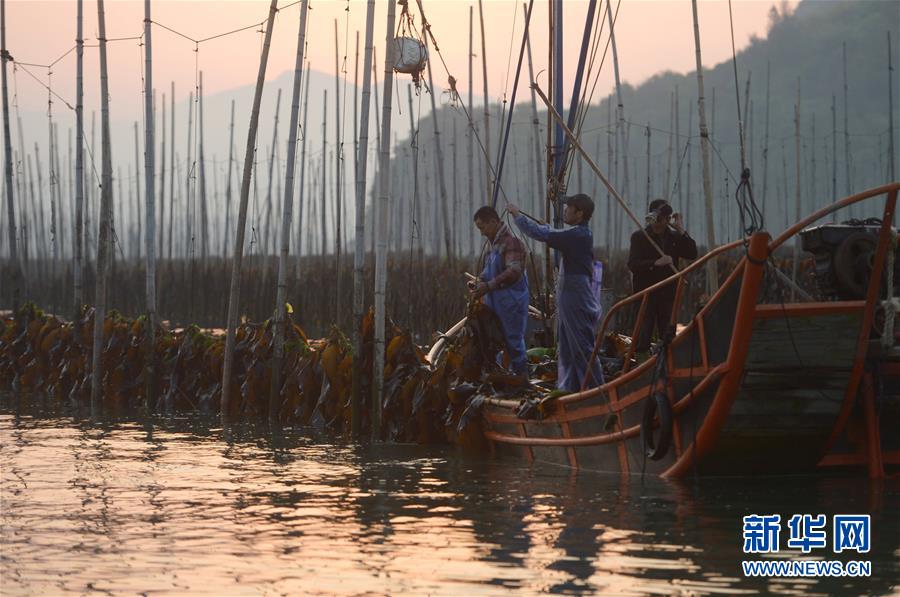 4月16日,在福建省霞浦县长春镇,当地渔民在收海带。