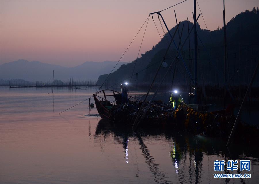 4月16日,在福建省霞浦县长春镇,当地渔民在收海带。