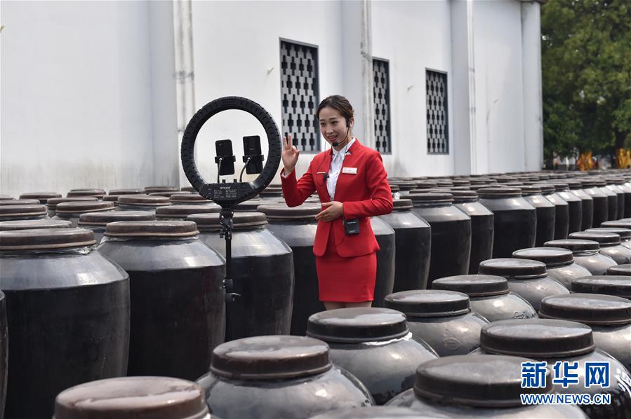 4月20日,在中国镇江醋文化博物馆,工作人员通过直播平台向观众讲解制醋工艺。新华社发(封疆江 摄)